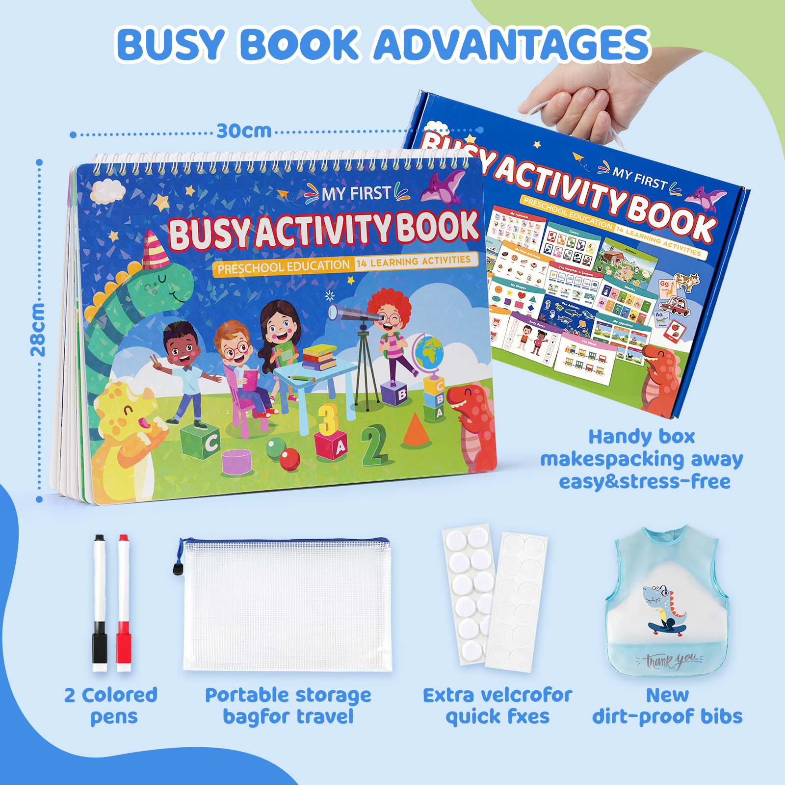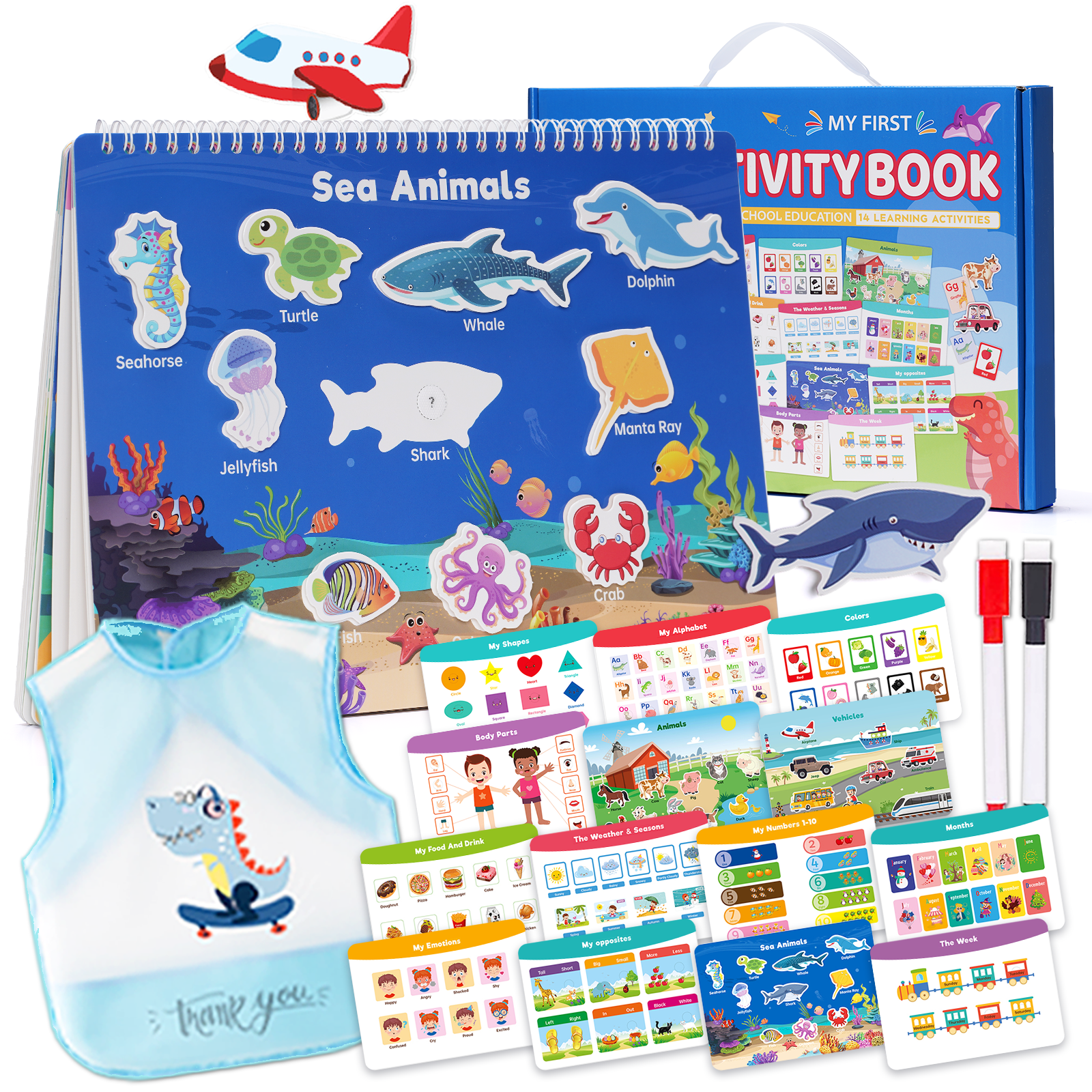 - 【No-assembled Toys】Comes pre-assembled & readyto use straight out of the box! Added a dirty and waterproof bib! Also comes with reusable thick velcro,2 marker eraser differential pen and a storage bag.