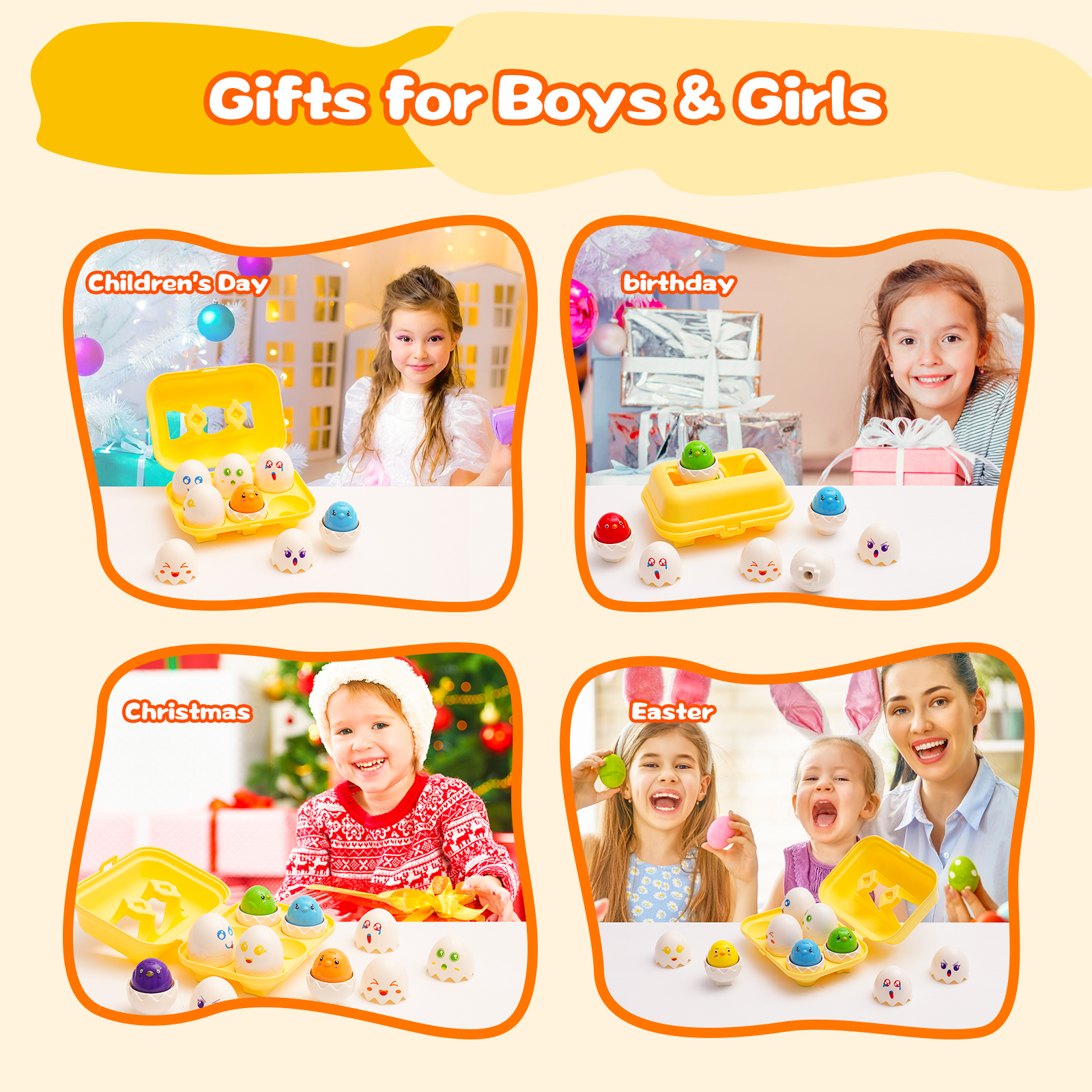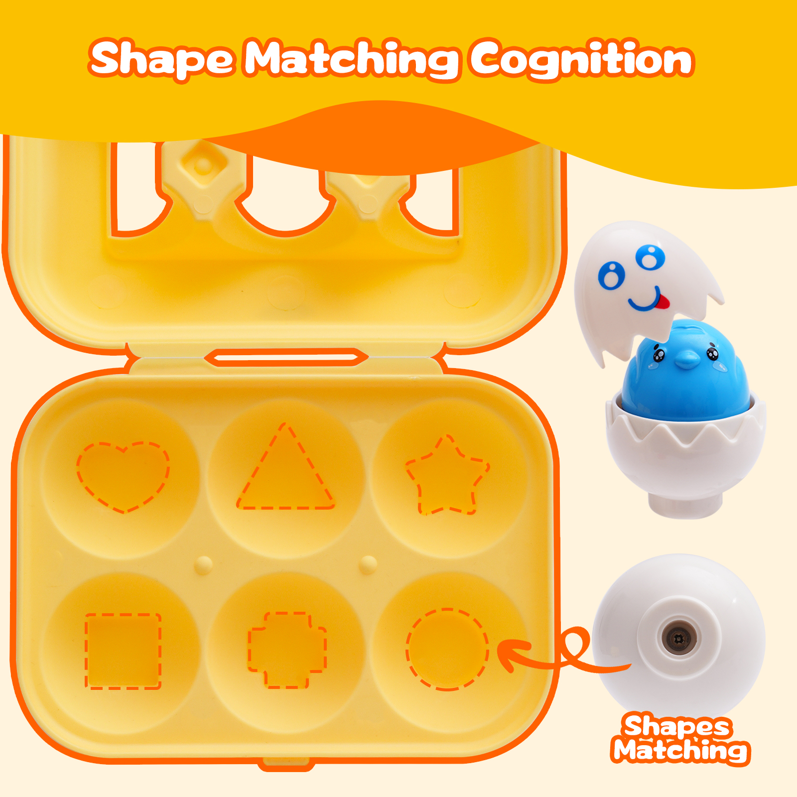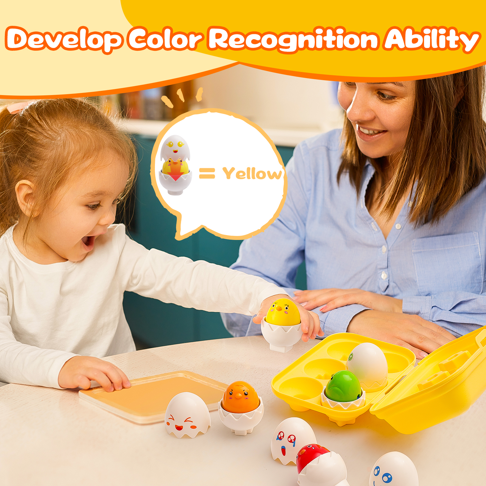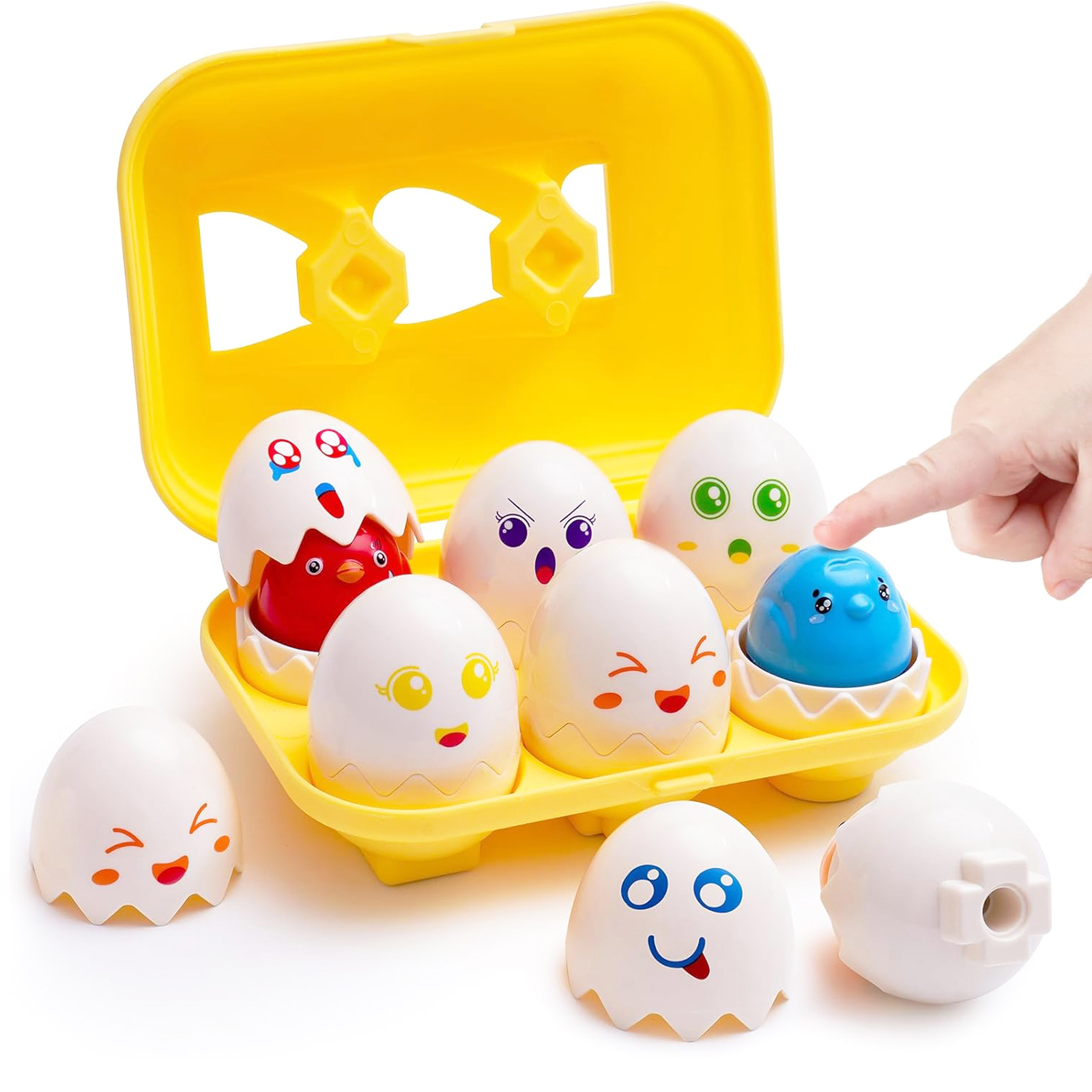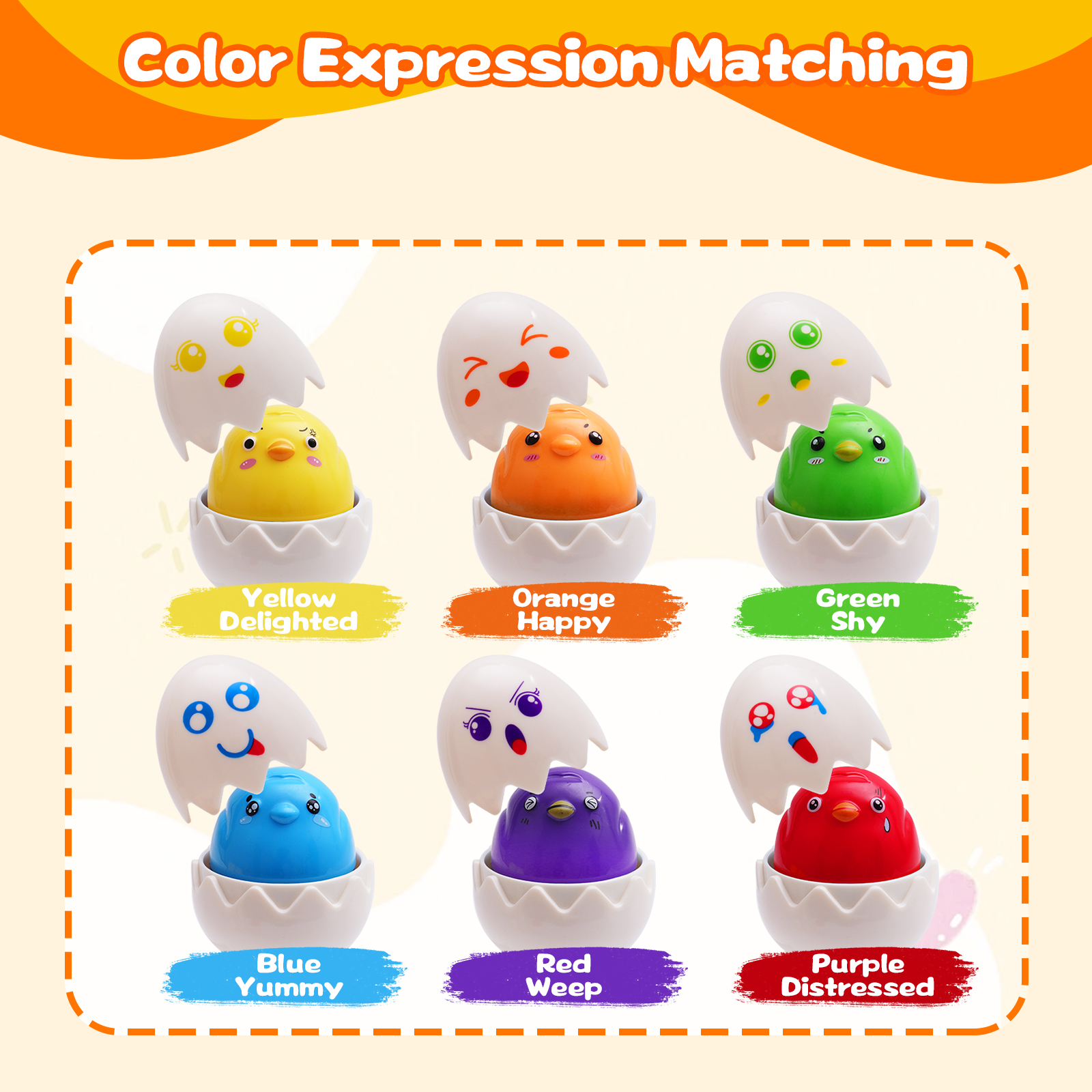 - Montessori Toys for 1-3 Year Old: 6 unique emotional eggs that make a faint squeaking sound (not a real chicken squawk) when pressed on the head, teaching children to recognize emotions while developing their sensory and motor skills
